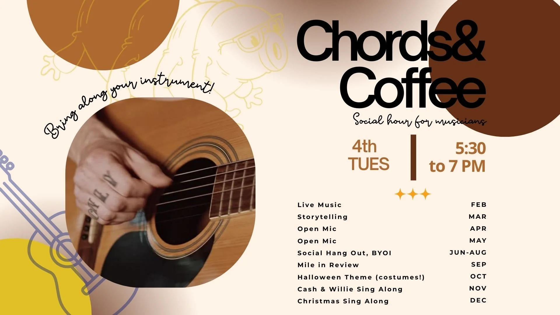 Chords & Coffee is a relaxed pop-in social hangout for local musicians to connect. Meet fellow players, talk shop, swap songs, and enjoy an easygoing music-friendly space.