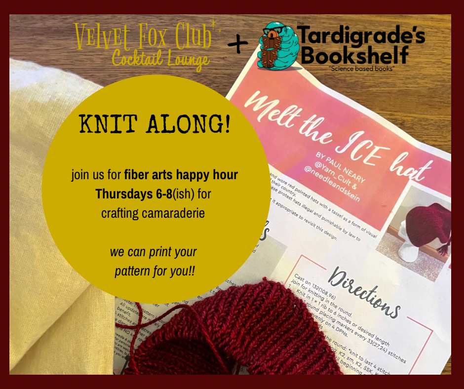 This February, our weekly Knit Along has a purpose. Join Velvet Fox Club Cocktail Lounge + Tardigrade’s Bookshelf every Thursday for a fiber arts happy hour focused on making knit caps for ICE protest and solidarity actions.